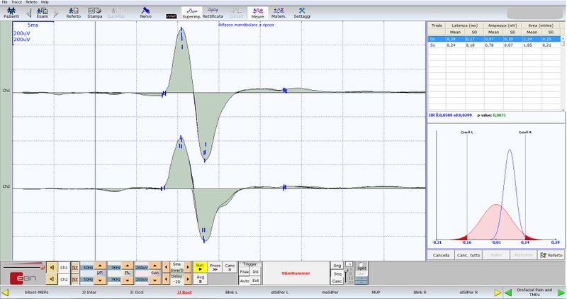 | Description | Jaw jerk in OrthoNeuroGnathodontics treatment Jaw jerk recorded on right masseter (upper trace) and left masseter (lower trace) after 5 years of follow up in a 2° Class hypodivergent morphology, treated through OrthoNeuroGnathodontics (EBNeuro, Firenze, Italy) | ||